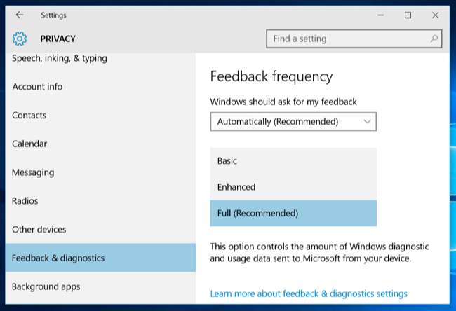 Indstillingen "Feedback & diagnostik" har en overraskende mulighed. Hvad der er særlig overraskende er, at Windows 10 faktisk ikke giver dig mulighed for at deaktivere denne mulighed.