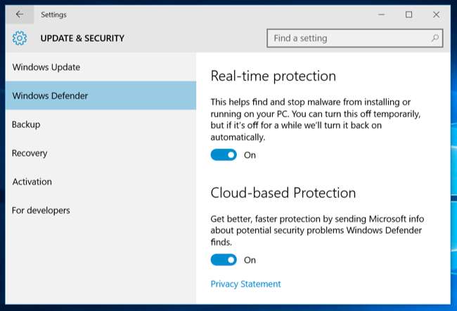 Windows 10 inkluderer Windows Defender-antivirusprogrammet , og det er aktiveret lige ud af kassen. Dette er efterfølgeren til Microsoft Security Essentials antivirus, der var tilgængeligt gratis på Windows 7. Indstillinger for dette er tilgængelige under Opdatering & sikkerhed> Windows Defender i appen Indstillinger. Windows Defender aktiverer automatisk realtidsbeskyttelse. Selvom du slukker for det, er det kun midlertidigt - det tænder den realtids antivirusbeskyttelse igen senere. Den eneste rigtige måde at slå den fra er at installere et tredjeparts antivirus. Windows Defender kører ikke, hvis et andet antivirusprogram kører.