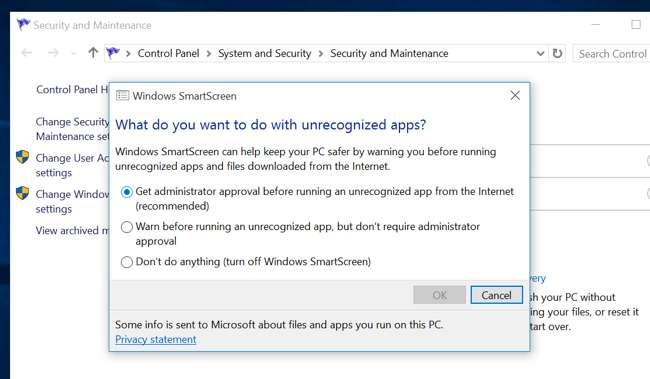 - 16. Windows SmartScreen i Stifinder - Disse indstillinger kan styres fra det gamle kontrolpanel. For at få adgang til dem skal du åbne Start-menuen, skrive "smartscreen" og klikke på "Skift SmartScreen-indstillinger." Dette fører dig til vinduet System og sikkerhed> Sikkerhed og vedligeholdelse i kontrolpanelet. Klik på linket "Skift Windows SmartScreen-indstillinger", og du kan deaktivere SmartScreen, hvis du vil.