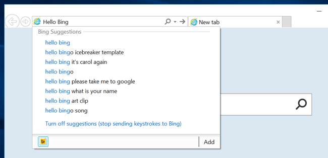 - 22. Bing-forslag - Som i Edge sendes alt, hvad du skriver i adresselinjen, til Microsofts Bing-søgemaskine for at give dig søgeforslag, medmindre du skifter søgemaskiner eller klikker på "Sluk forslag (stop med at sende tastetryk til Bing)" efter at have skrevet i adresselinjen. .