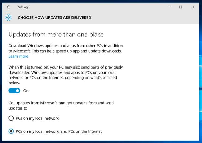 Selvom det ikke teknisk set er "at ringe hjem", Windows opdatering bruger din uploadbåndbredde som standard til at uploade Windows-opdateringer til andre brugere. Det ligner BitTorrent og ligner, hvordan Blizzards Battle.net-downloader distribuerer spilopdateringer. Disse indstillinger kan kontrolleres under Indstillinger> Opdatering og sikkerhed> Windows Update> Avancerede indstillinger> Vælg, hvordan opdateringer skal leveres. Du kan få Windows til kun at dele opdateringer med pc'er på dit lokale netværk, ikke hele Internettet.