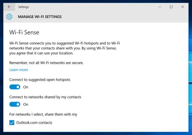 - 30. Og i Sense - Disse indstillinger kan kontrolleres under Indstillinger> Wi-Fi> Administrer Wi-Fi-indstillinger. Bemærk, at Windows 10 faktisk ikke deler dit Wi-Fi-netværks adgangssætning med nogen anden, medmindre du vælger at dele det enkelte netværk manuelt. Men hvis du giver en ven adgang til din adgangssætning, og de opretter forbindelse og klikker på indstillingen Del, kan de dele den med hele deres netværk af Facebook-, Skype- og Outlook.com-e-mail-kontakter og give dem adgang til dit Wi-Fi-netværk.