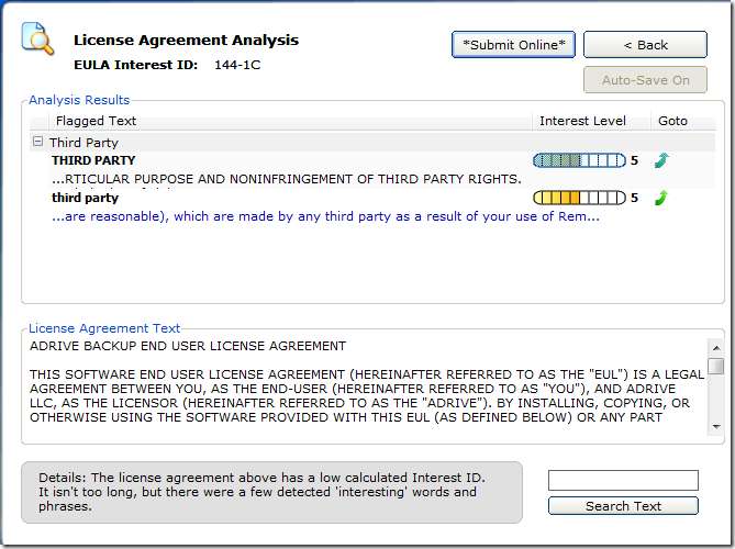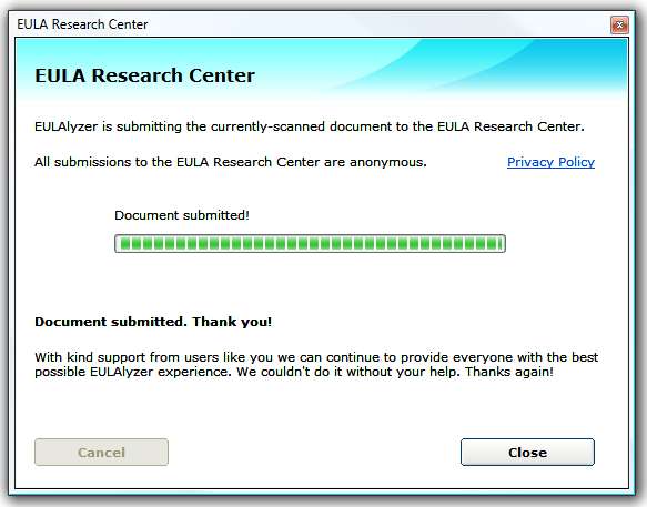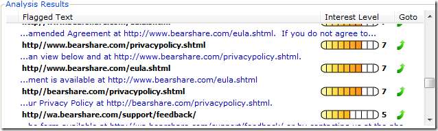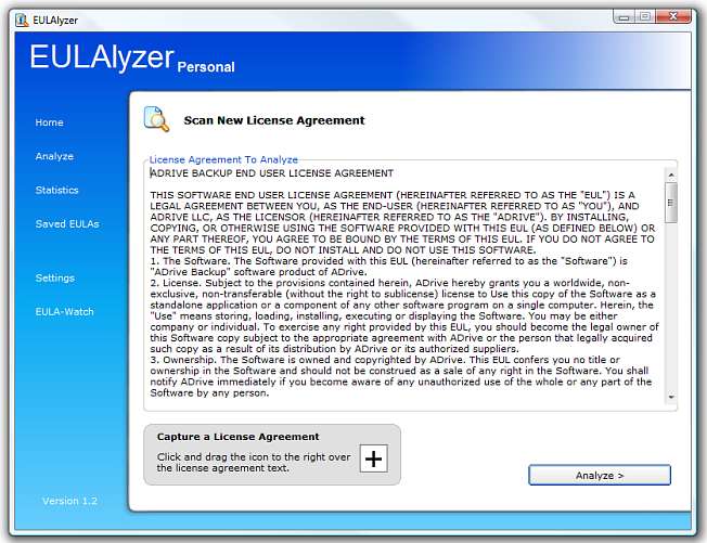 I nogle tilfælde fungerer dette ikke, så du kan bare kopiere og passere teksten til aftalen til EULAlyzer. Tryk derefter på knappen Analyser.