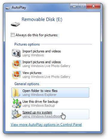 Indsæt et SD-kort i din kortlæser, eller tilslut et USB-flashdrev til en USB-port på din computer. Windows ser automatisk, om din flashhukommelse er ReadyBoost-kompatibel, og i så fald kan du direkte vælge at fremskynde din computer med ReadyBoost.
