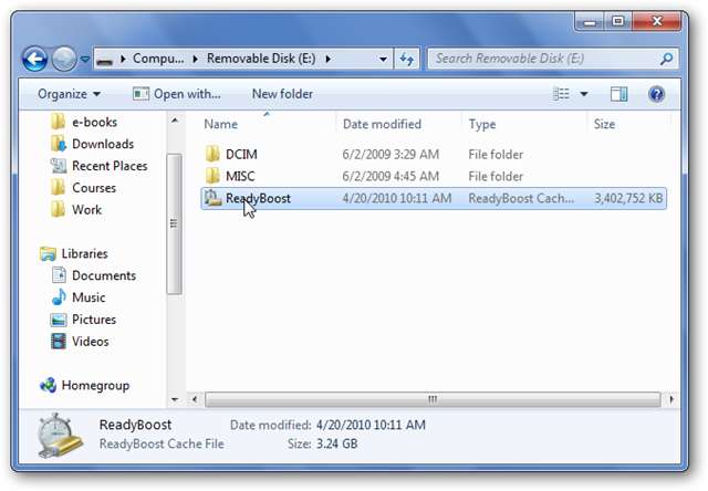 Når du ser dit SD-kort eller flashdrev i Explorer, vil du bemærke en ReadyBoost-fil i den størrelse, du valgte før. Dette slettes, når du skubber dit kort eller flashdrev ud.