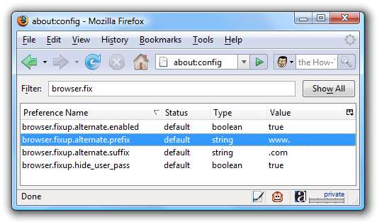 - browser.fixup.alternate.suffix - Denne værdi indstiller, hvad der tildeles efter nøgleordet. For eksempel kan du bruge dette til at ændre standardsuffikset til din landekode, som f.eks .co.uk