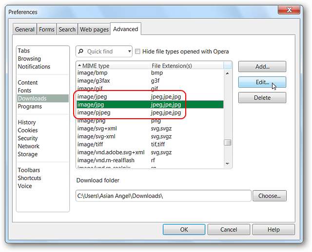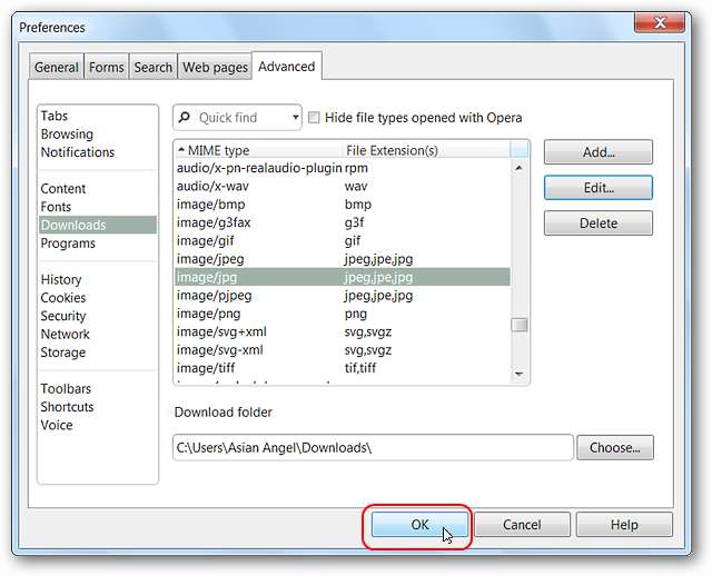Bemærk: Du kan foretage en hurtig søgning efter den specifikke filtype, men at have et godt kig gennem listen er nyttigt for at blive mere fortrolig med denne del af Operas indstillinger.