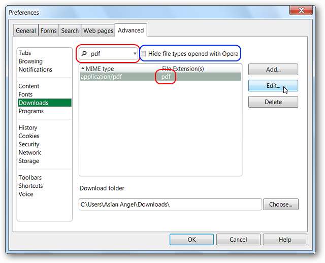 Når Indstillingsvindue åbner gå til Fanen Avanceret og klik på Downloads . Den første ting, du bliver nødt til at gøre, er at fravælge Skjul filtyper åbnet med Opera mulighed.