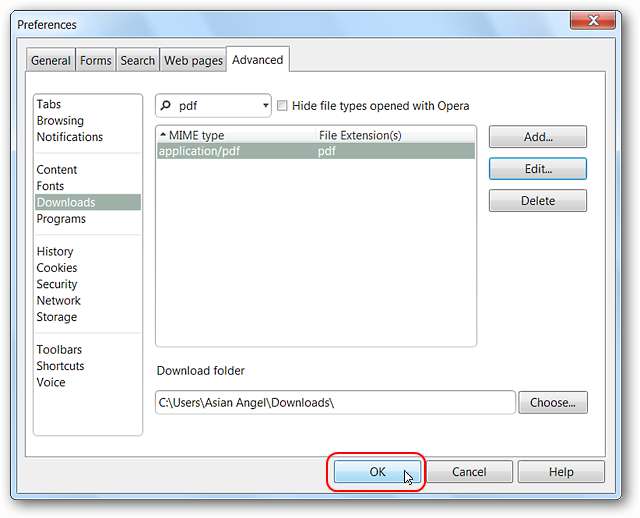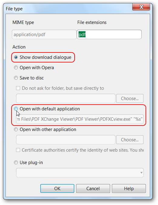 Denne gang kan du se, at standardhandlingen er at vise en download-dialog. På dette tidspunkt kan du vælge at lade det være som det er, have pdf-filerne åbne i Opera, gå med standardapplikationen vist eller vælge din favorit. På vores system var standardapplikationen nøjagtigt det, vi ledte efter. Klik på Okay når du er færdig.