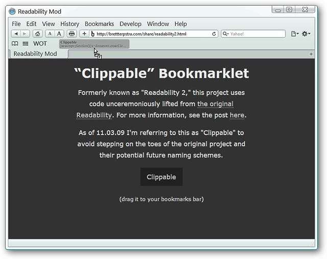 For at installere Clippable skal du bare gå til webstedet, få fat i bogmærket og trække det til din "Bogmærkeværktøjslinje". Nu er du klar til øjeblikkeligt et-klik “rengøring af websiden”.