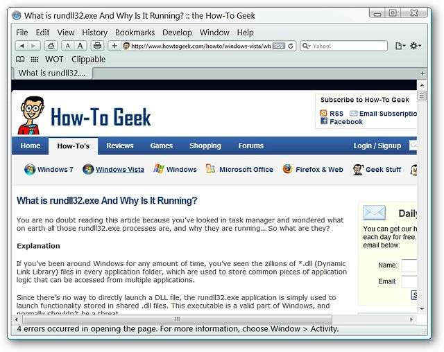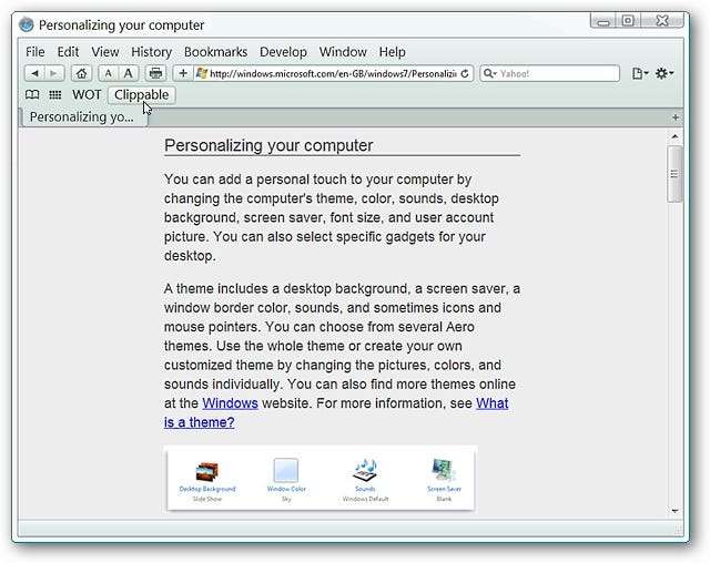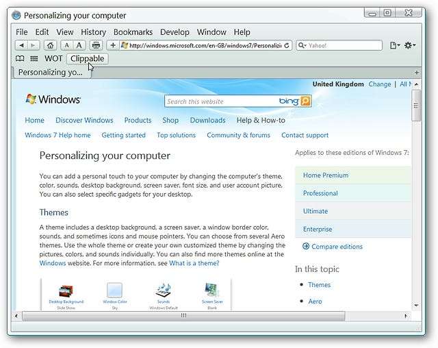 For vores eksempel besluttede vi at besøge Microsofts webside med oplysninger om tilpasning af Windows 7. Bemærk alle elementerne øverst på siden og på siderne ...