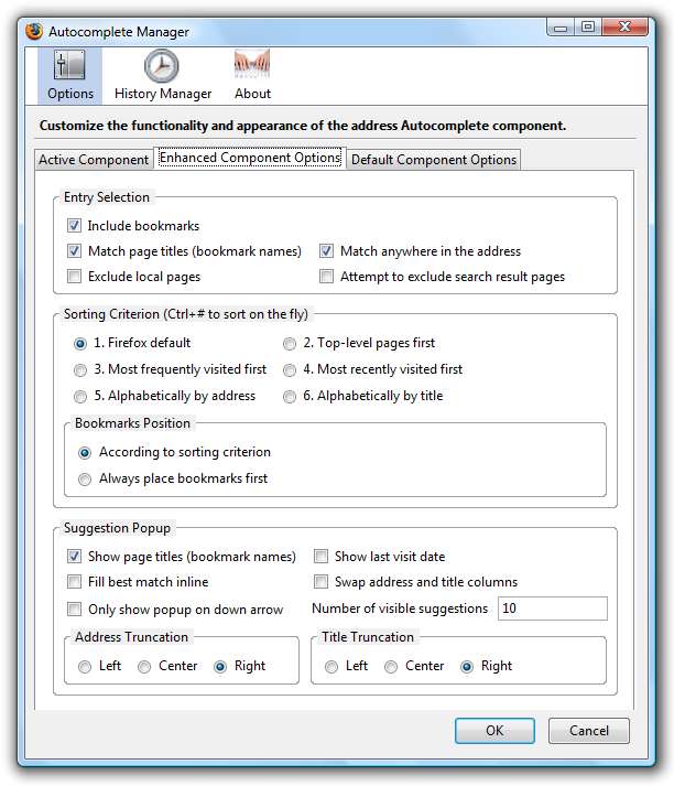 Svaret er udvidelsen Autocomplete Manager, som giver dig masser af bedre funktionalitet, såsom delvis matching mod enten linket eller titlen på et bogmærke eller en historieindgang.