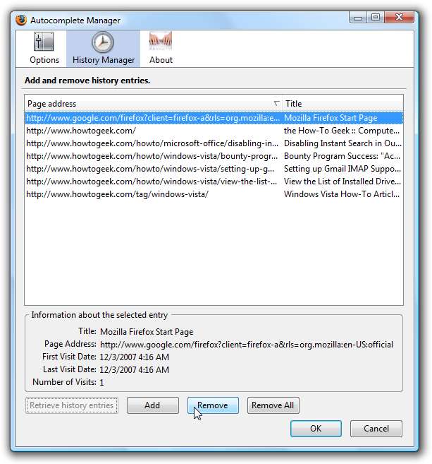 Her er den ene mærkelighed ... denne udvidelse gemmer sin egen historikdatabase, så for at rydde adresselinjens historie skal du åbne fanen Historikmanager ved at klikke på knappen Hent og derefter fjerne alt. Selv når du gør det, skal du stadig genstarte Firefox, før adresselinjen stopper med at returnere resultater.