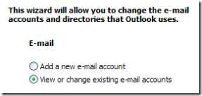 Som standard vises en guide-skærm med "Vis eller skift eksisterende e-mail-konti" valgt som standard. Vælg næste på dette skærmbillede.