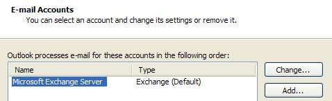 Du vil se en skærm med dine e-mail-konti her. Vælg den der siger "Microsoft Exchange Server", og klik derefter på knappen Skift: