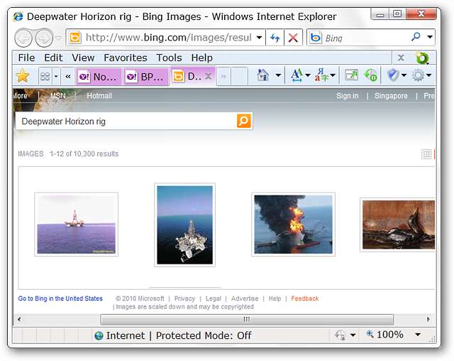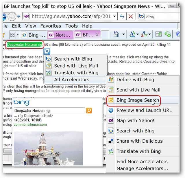 For det første af vores to eksempler valgte vi “Deepwater Horizon rig”. For at finde billeder fremhæv det ord / navn, du er interesseret i, og vælg Bing-billedsøgning i genvejsmenuen. Hvis du holder musen over kontekstmenuoversigten, vises et "top" -billede i et popup-vindue ...