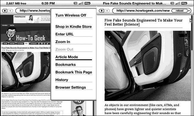 Den første metode kræver ingen indsats udefra. Naviger på din Kindle til Menu -> Eksperimentel -> Webbrowser og tryk derefter på adressen på et websted, du vil læse artikler om. Når du finder en artikel, du vil læse, er alt hvad du skal gøre, at gøre tryk på Enter-tasten og navigere i zoomruden, der ser ud til at fremhæve artiklens brødtekst (i stedet for annoncer, sidebjælker og lignende). Tryk på Menu knap igen og vælg Modevare . Kindle zoomer og omformaterer teksten for dig. Det er ikke perfekt, men det fungerer meget godt det meste af tiden. Du kan se resultaterne i skærmbilledet ovenfor.