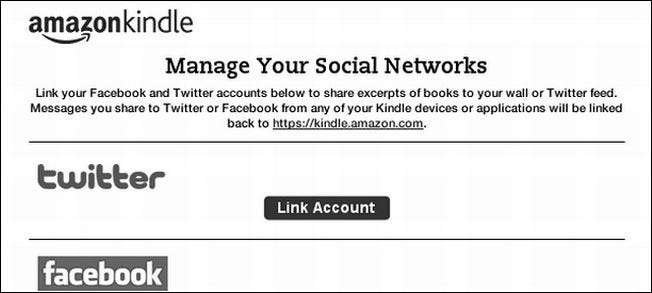Selvom ingen vil kaste deres smartphone til side for at begynde at gennemse Facebook fra deres Kindle, kan du skubbe opdateringer til sociale medier fra din Kindle til både Twitter og Facebook. Hele opsætningen er designet til at gøre det let at dele uddrag af tekst fra bøger, du læser. Hvis du er interesseret i at lege med det, skal du navigere til Menu -> Indstillinger -> Sociale netværk -> Administrer . Der kan du give din Kindle tilladelse til at få adgang til både din Twitter- og Facebook-konto. Deling er ret primitiv og vil ideelt set dele en lille URL til den bog, du taler om, men for nu er du begrænset til at dele citater fra bogen, der kan tilføjes med en brugerdefineret besked.