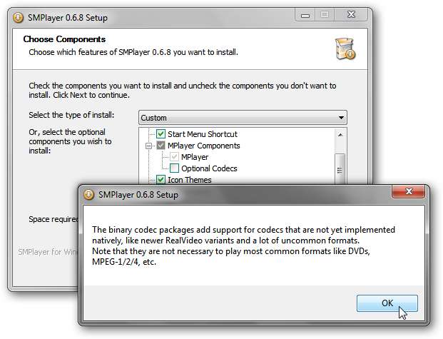 Installation er ligetil ved hjælp af den velkendte installationsguide. En mulighed, som du måske eller måske ikke vil installere, er et sæt valgfrie codecs. Disse codecs er gemt i SMPlayers katalog og ikke i nogen af Windows-systemmapper.