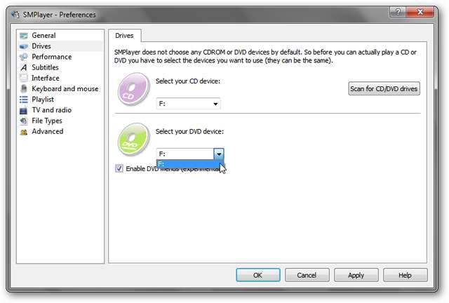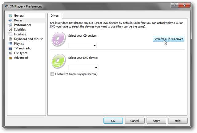 Klik på elementet Drev på listen til venstre. Hvis du kender drevbogstavet til dit CD / DVD-drev, skal du vælge dem her. Hvis ikke, skal du klikke på knappen Scan for CD / DVD Drives.