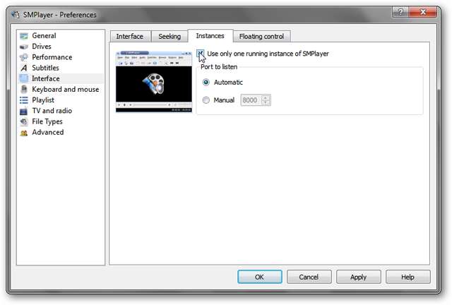 Klik på interface-elementet på listen til venstre og derefter på fanen Forekomster. Sæt et afkrydsningsfelt i feltet mærket "Brug kun en kørende forekomst af SMPlayer" Hvis du ikke gør det, når du dobbeltklikker på en film, mens en anden afspilles, åbner den en anden forekomst af SMPlayer og spiller begge videoer kl. den samme tid.
