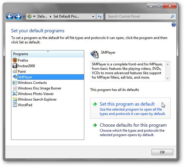 Dette fungerer ikke i Windows 7, medmindre du kører SMPlayer som administrator. I stedet er det lettere at bruge Windows 7's indbyggede standardprogrammervælger.