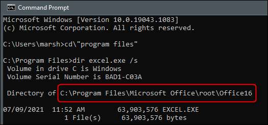 En anden måde at åbne Excel på er at finde filen, der indeholder Excel.exe-filen, der skifter til den pågældende mappe i kommandoprompt, og derefter kører en simpel kommando.