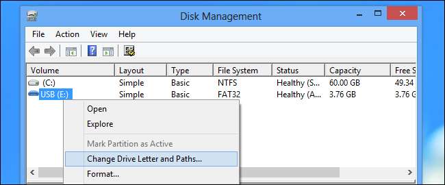 Find den flytbare enhed, du vil bruge, i vinduet Diskadministration, højreklik på den, og vælg Skift drevbogstav og stier.