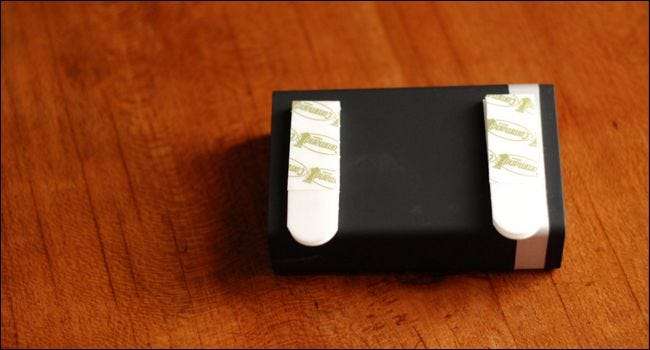 For at fastgøre opladeren til natbordet anbefaler vi 3M Command-mærket af aftagelige klæbestrimler. Hvis du bruger Command Picture Hanging Strips ($ 4) adskiller de sig fra hinanden, ligesom velcro, så du kan fjerne opladeren til at tage med dig, mens du rejser, hvis du ønsker det. Det er nemmest at anvende dem, hvis du først klæber dem sammen og derefter fjerner klæbemidlet på den ene side og trykker dem fast på opladeren, som det ses nedenfor. Prøv at placere dem længere fra hinanden, da det fordeler belastningen mere jævnt og forhindrer opladeren i at vride, når du tilslutter og frakobler kabler.