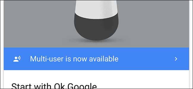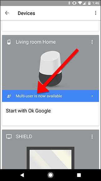 Rul for at finde dit Google Home på listen over enheder. Tryk på det blå banner, der lyder "Multi-user is now available."