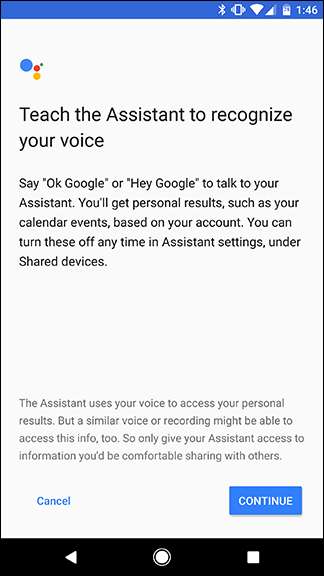 Hvis du ikke allerede har gjort det, starter Google processen for at lære at genkende din stemme. Sørg for, at du er i samme rum som dit Google Home, og at det er stille, så Google kan optage din stemme.
