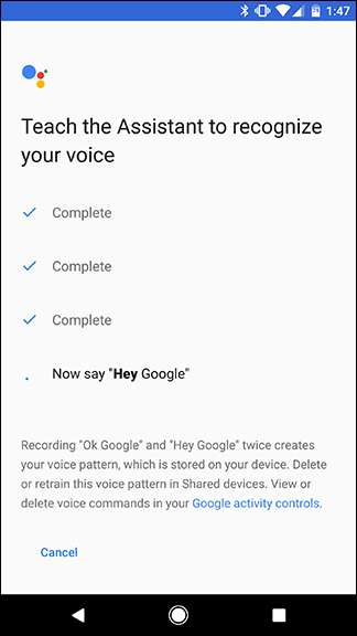 Google vil bede dig om at sige "Ok, Google" og "Hej, Google" et par gange for at lære dine stemmemønstre. Du kan også omskole Google senere, hvis du finder ud af, at det ikke også registrerer din stemme i fremtiden.