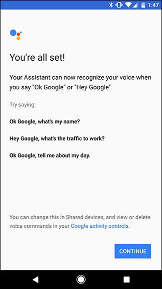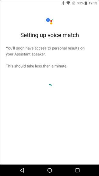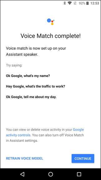 Voice Match-skærmen starter, hvor den beder dig om at sige "OK Google" og "Hey Google." Når du har gjort det, er du færdig.