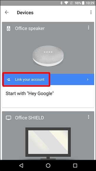 For at gøre det skal du starte Home-appen på den telefon og logge ind. Derefter skal du trykke på knappen Enheder øverst til højre og derefter finde det Google Home, du vil tilføje.
