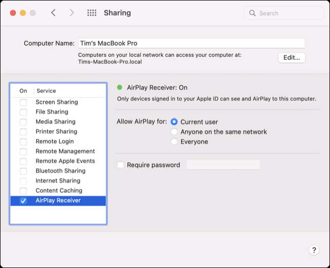 Hoved til systemindstillinger & GT; Deling og klik på "AirPlay Receiver" i listen, der vises til venstre.
