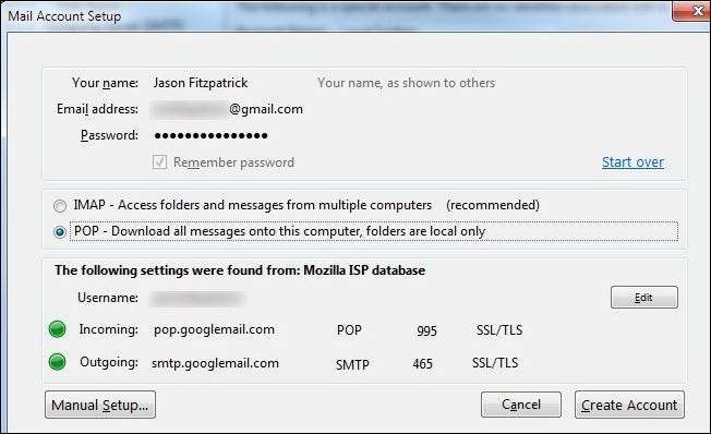 Udfyld dit brugernavn og din adgangskode, og klik derefter på Fortsæt. For et betydeligt antal web-mail-udbydere vil Thunderbird automatisk udfylde serveroplysningerne (med tilladelse fra Mozilla ISP-database) som det fremgår af nedenstående skærmbillede. Vi skifter fra IMAP-standard til POP. Hvis du planlagde at bruge Thunderbird som din daglige e-mail-klient, ville IMAP være et meget overlegen valg (IMAP giver dig mulighed for at arbejde med e-mail som en ekstern adgangsfildeling i stedet for at downloade den til din lokale maskine). Til vores arkiveringsformål er POP imidlertid et overlegen valg, da det nemt og uden besvær kan downloade alle de gamle e-mail-meddelelser (ikke kun de nye). Hvis du finder ud af, at du vil bruge Thunderbird som en fuldtids klient, kan du nemt skifte tilbage til IMAP, når du har et arkiv med dine gamle e-mails.