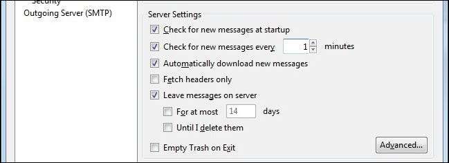 Mens vi stadig er i Bruger indstillinger skærm skal vi kontrollere et par meget vigtige indstillinger inden vi forlader. Klik på Serverindstillinger under dit kontos loginnavn på venstre side af vinduet. Vi er nødt til at foretage nogle få justeringer her. Skift Se efter nye beskeder hvert 10. minut indstilling til 1 minut . Til den indledende download har vi brug for hyppigheden af kontrol virkelig høj. Sørg også for Efterlad beskeder på serveren er kontrolleret og uncheck For at most… og Indtil jeg sletter dem .