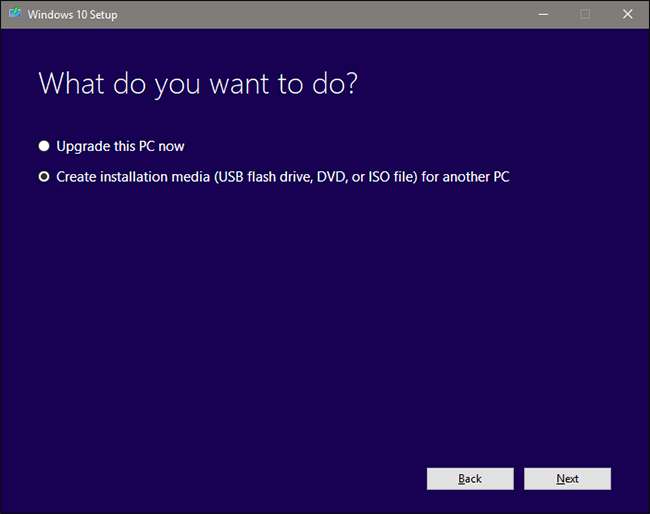 Gå til dette websted på en anden Windows-computer og download Media Creation Tool fra Microsoft. Tilslut et tomt (eller uvigtigt) flashdrev med mindst 8 GB plads. Bemærk, at alt, der er gemt på dette USB-drev, slettes ved installationsprocessen, så hvis du har noget på det, skal du flytte det et andet sted nu. Dobbeltklik på programmet, og følg derefter nedenstående trin.