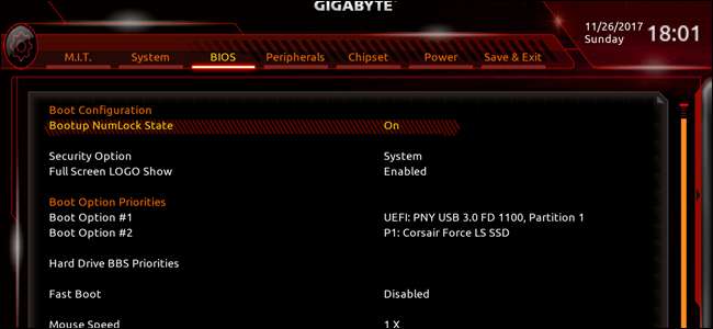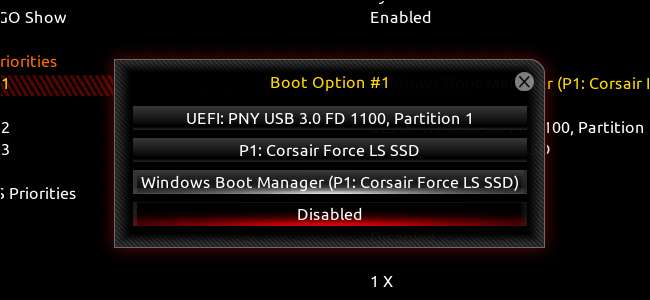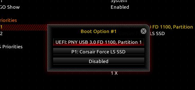 Sæt drevet i en USB-port, tænd derefter pc'en, og følg skærmmeddelelsen for at starte UEFI eller BIOS (ligesom vi gjorde i del tre ).