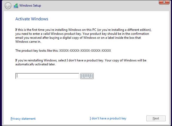 Hvis du har en Windows-nøgle, skal du indtaste den på denne skærm og klikke på "Næste". Hvis du ikke gør det, skal du ikke svede: Klik bare på "Jeg har ikke en produktnøgle", og vælg derefter den version af Windows, du vil bruge (enten "Hjem" eller "Pro" for de fleste mennesker). Du kan indtaste din nøgle i selve Windows senere eller købe en fra Microsoft på din fritid - teknisk set du behøver ikke engang en til at bruge Windows 10 .