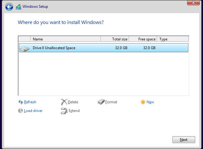 Forudsat at du bruger en enkelt ny harddisk eller solid state-drev, skal din skærm se sådan ud. Hvis du har flere drev installeret, vil der være flere emner med "Ikke-allokeret plads", opført i rækkefølge som drev 0, drev 1, drev 2 osv. Rækkefølgen af disse drev betyder ikke noget, det er baseret på rækkefølgen af SATA-porte på dit bundkort.