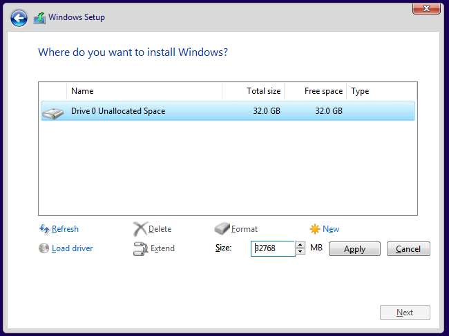 Vælg det drev, du vil installere Windows på, og klik på "Ny" for at oprette en ny partition på drevet. Vælg den maksimale mængde data, der er tilgængelig for dit drev, når du bliver bedt om det. Klik på "Anvend" for at oprette partitionen, og derefter "Okay", da Windows giver dig en advarselsmeddelelse om flere partitioner. Det vil skabe nogle nye partitioner, som Windows bruger til forskellige pre-boot- og gendannelsesværktøjer.
