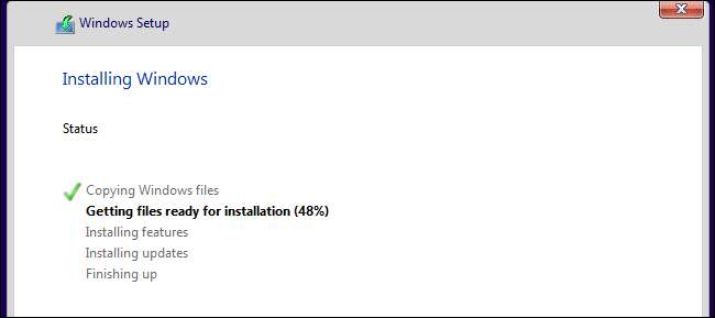 Nu kopierer Windows filer fra USB-drevet eller DVD'en til dit lagerdrev, installerer OS og får generelt ting opsat til dig. Det genstarter muligvis computeren flere gange; det er fint. Processen tager et sted mellem et par minutter og en time baseret på variabler som din lagringstype, processorhastighed, USB-drevhastighed osv. Gå og se en anden episode af Fresh Prince .