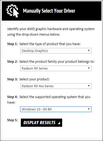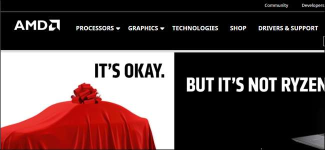 Lad os installere AMD-driveren til vores pc's grafikkort som et eksempel. Kassen siger, at grafikkortet er en AMD Radeon RX 460, og jeg har ingen grund til at mistanke om, at modelnummeret lyver for mig. Lige på forsiden af AMD-webstedet er der et link til KØRERE & SUPPORT .