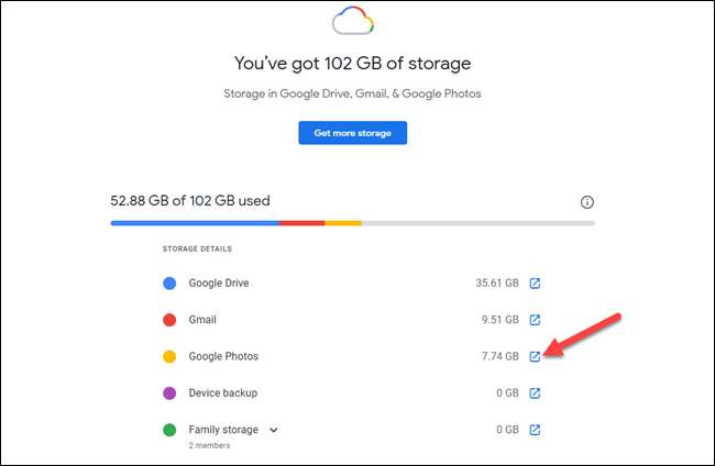 Google One-abonnenter vil se en sammenbrud svarende til dette. Vælg ikonet Pil-Box ud for et afsnit for at gå direkte til den pågældende service og administrer opbevaring.