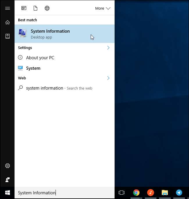 Du finder disse oplysninger i panelet Systeminformation . For at åbne den skal du åbne din Start-menu og skrive “Systeminformation”. Start genvej til systeminformation.
