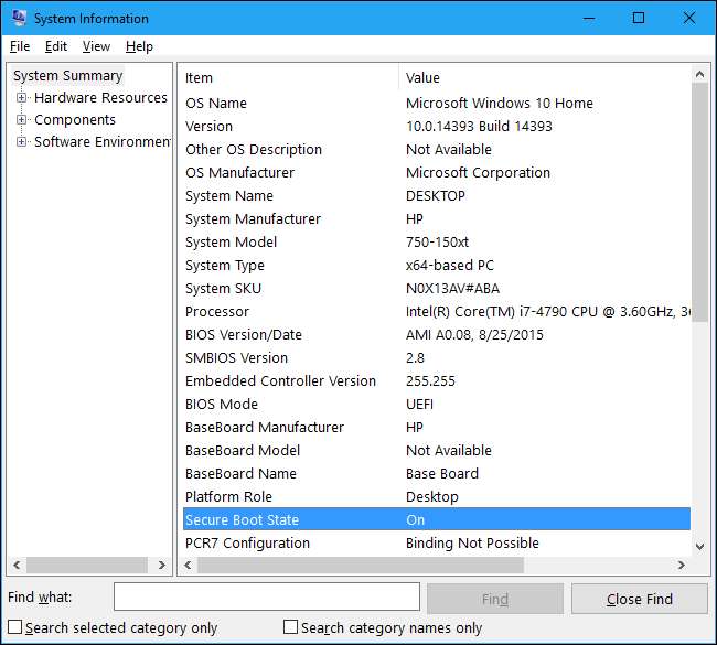 Vælg "Systemoversigt" i venstre rude, og se efter "Sikker opstartstilstand" i højre rude.