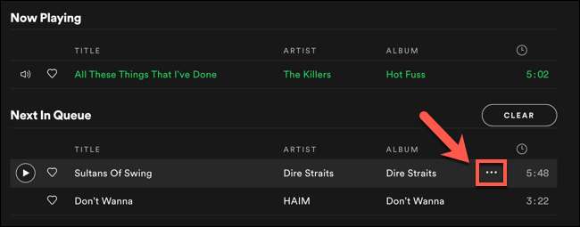 Dette er også muligt, hvis du har tilføjet sange til din kø manuelt. For at fjerne en sang fra din kø på din pc eller Mac, skal du svinge over en sang i køen og vælge ikonet Tre dot.