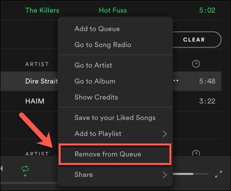Dette vil fjerne sangen (eller sangene) fra din kø. For afspilningsliste sange forbliver eventuelle sange, du fjerner, i din afspilningsliste, men Spotify vil springe over dem under denne session.