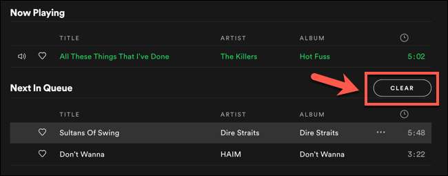 Hvis du har tilføjet sange til din kø manuelt, vil du se dem, der er angivet i afsnittet "Næste i kø øverst på din køliste. Ved siden af kategoriets titel er knappen "Clear Queue".